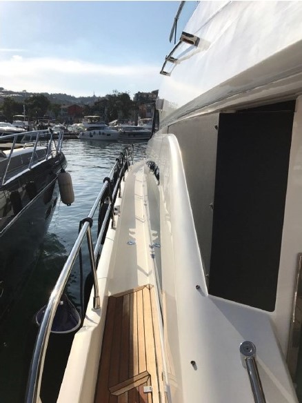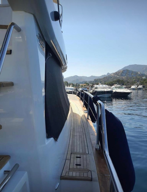 The generous foredeck sun-bathing area is accessed from the cockpit via wide side decks with high stainless steel handrails to allow easy movement around the boat, a key point for non-boating guests and crew.