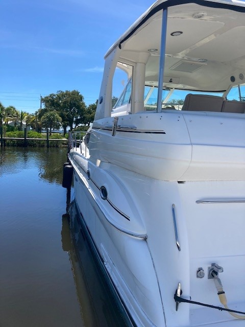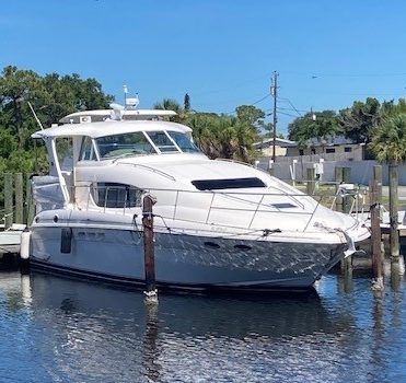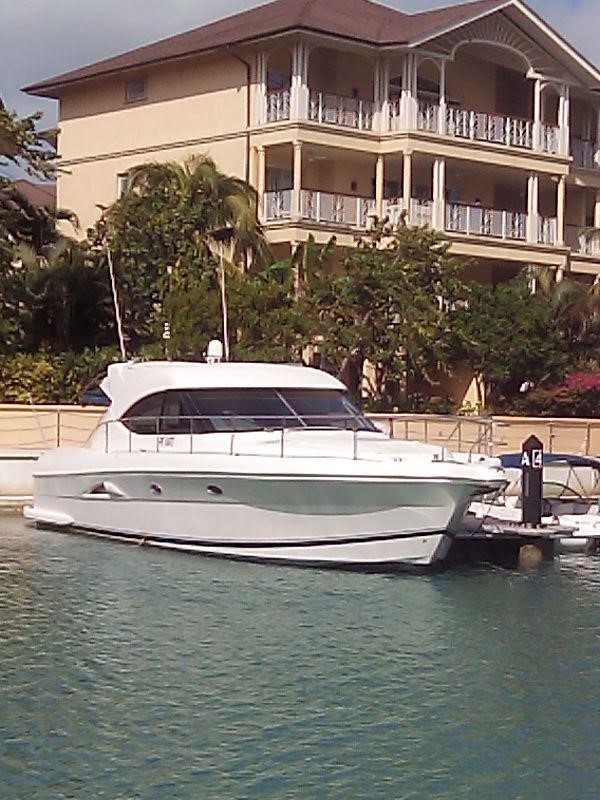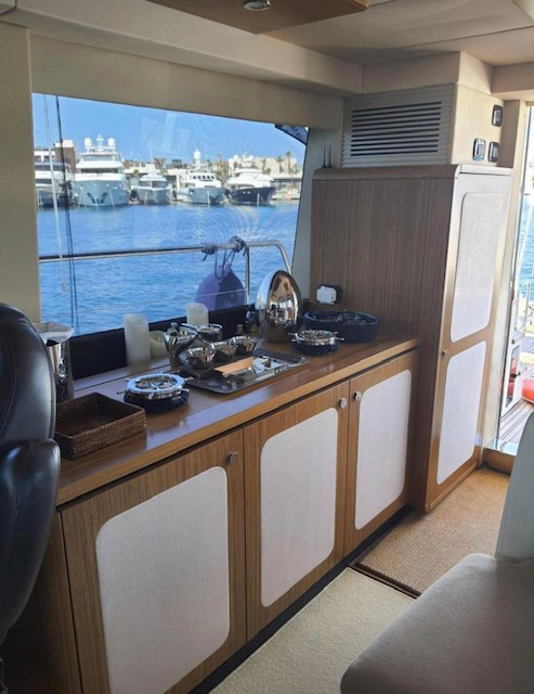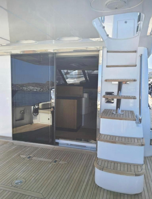 From the flybridge integral steps lead down to the covered aft cockpit with teak-laid decks, weatherproof seating and access hatch to the crew cabin with ensuite facilities.