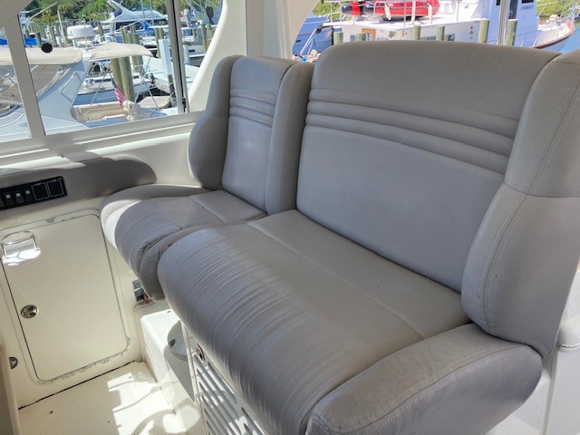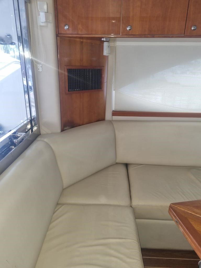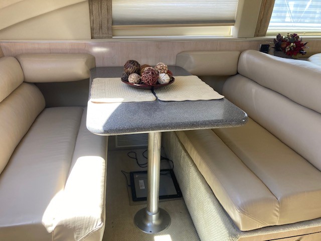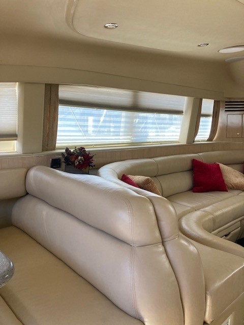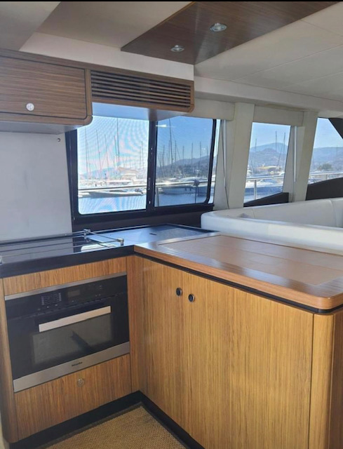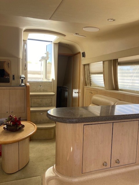 The saloon boasts a generous spacious seating and entertaining area. Steps rise to the dining area, fully equipped galley, main helm position and access to cabins below.
