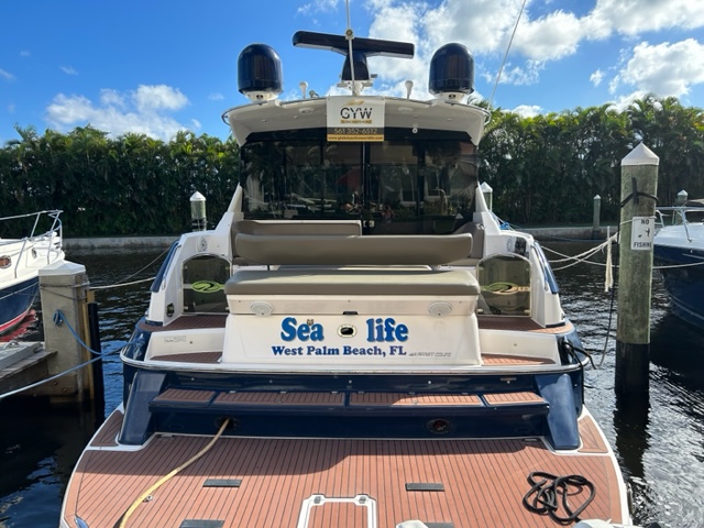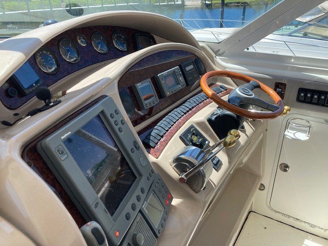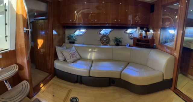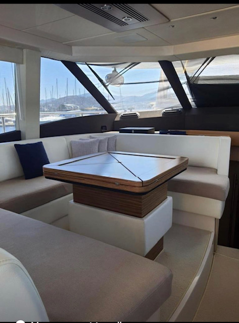 Highlights of the Squadron 58 include a spacious flybridge, which features two helm seats to the central console steering position. Forward of the helmsman position is a sunpad for private sunbathing, which also can provide further seating for guests. Aft, the C-shaped seating allows for generous entertaining and alfresco dining and a wet bar.