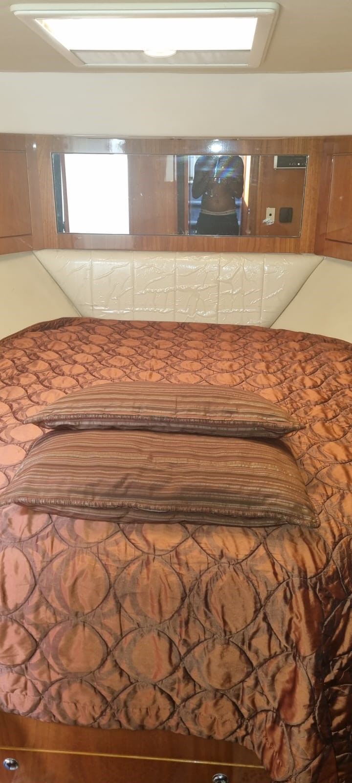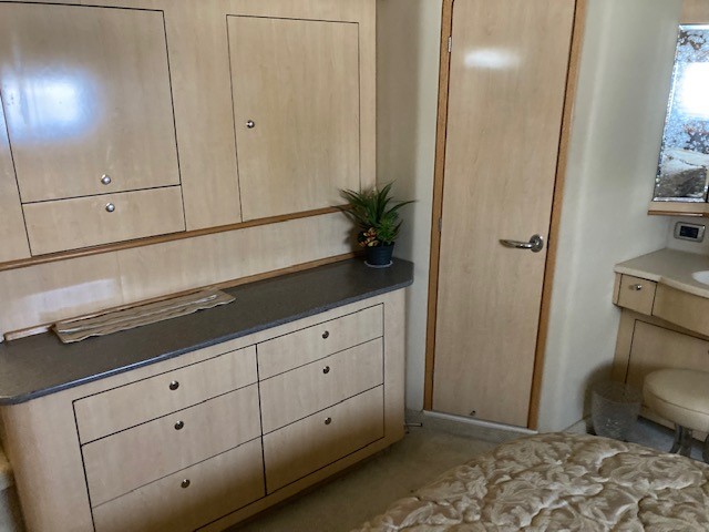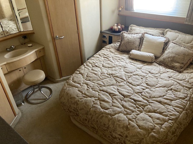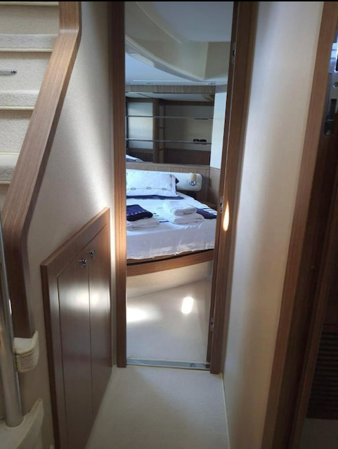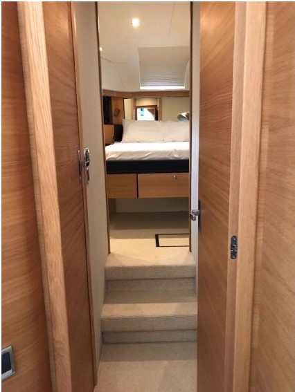 The full width master cabin features a full size bed, has generously proportioned en-suite facilities and clothes storage and walk-in full height closet. Two guest cabins, a double and twin, are fitted to the same standard. A day head is standard