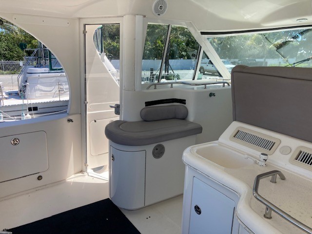 From the aft cockpit, full-width doors lead to the interior, which is light and spacious. The boat has full standing headroom throughout its interior.