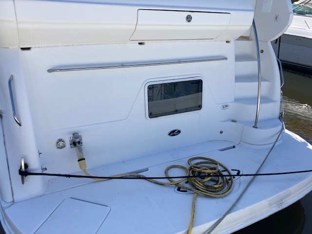 Twin transom gates lead to the bathing platform with tender storage, bathing ladder, hot and cold shower, wet locker and hydraulic passerelle.